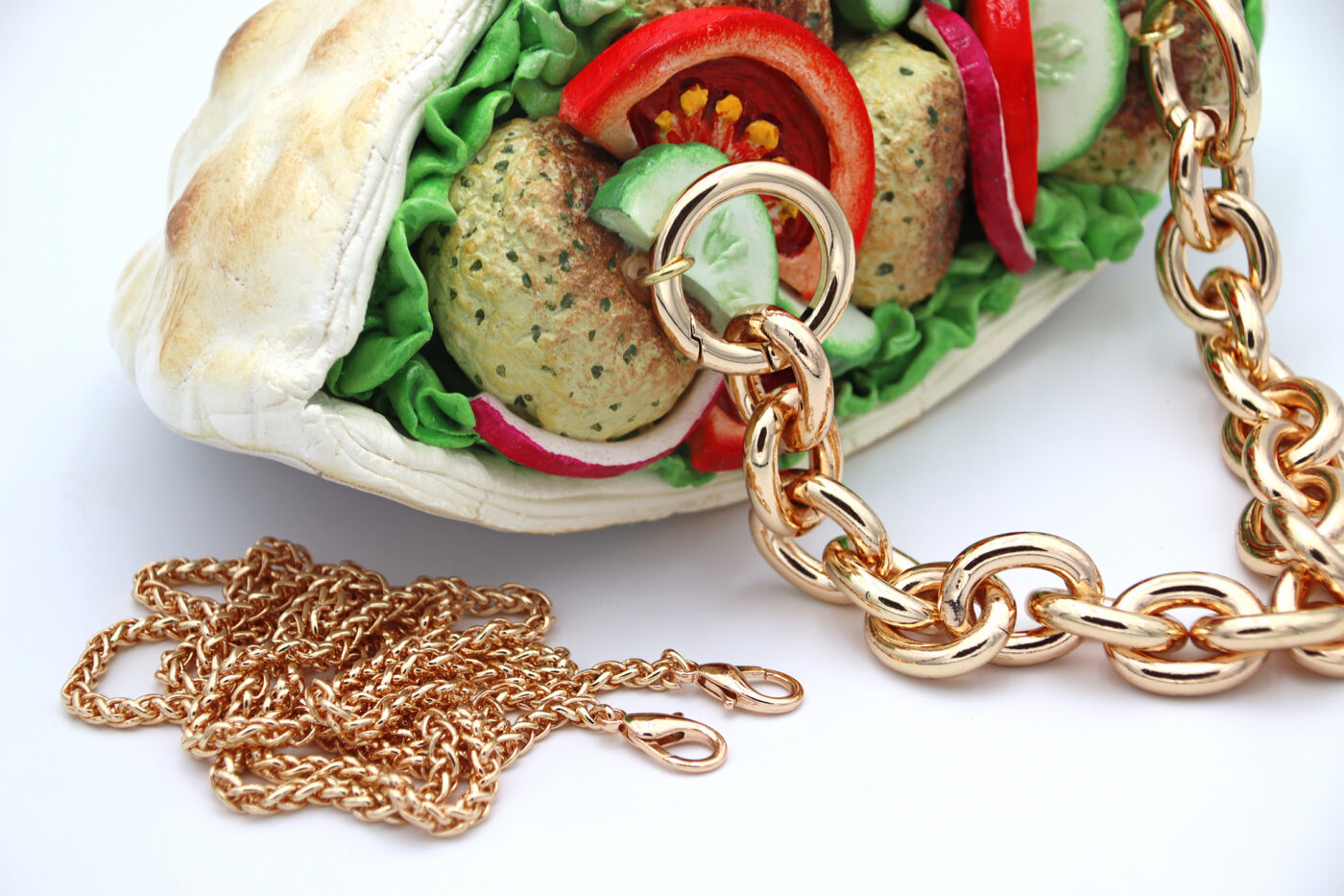 The purse comes with a chunky golden top handle + golden cross-body chain (120 cm)