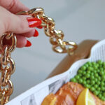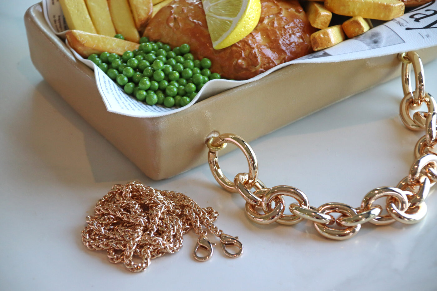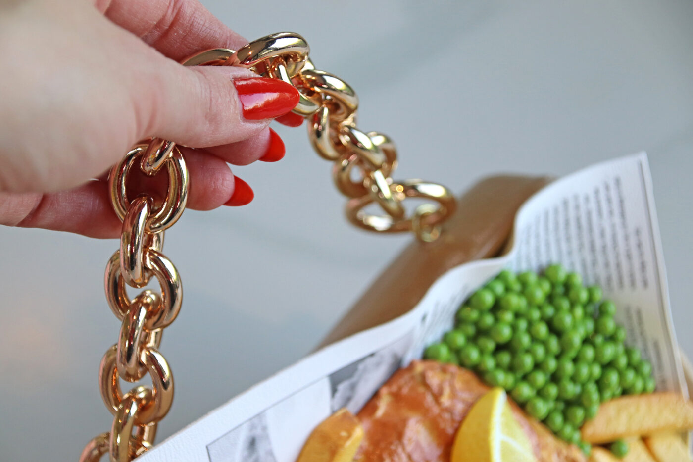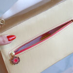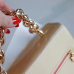 The coin purse comes with a golden chunky top handle + golden cross-body chain (120 cm)