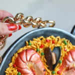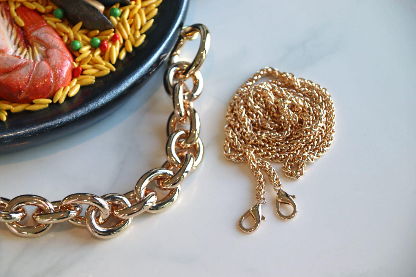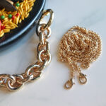 The purse comes with a golden chunky top handle + golden cross-body chain (120 cm)